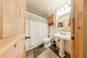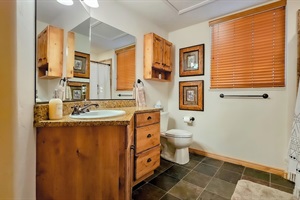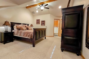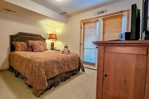 Summit Haven features two tastefully furnished bedrooms, each designed to ensure a restful night's sleep. The master bedroom boasts a comfortable king-size bed, as well as a twin-day bed with a trundle, and TV inside the armoire. The main floor bedroom features a queen bed, private balcony, and a TV. Both bedrooms come with ample storage space and have easy access to their bathrooms, complete with modern fixtures and fresh towels.